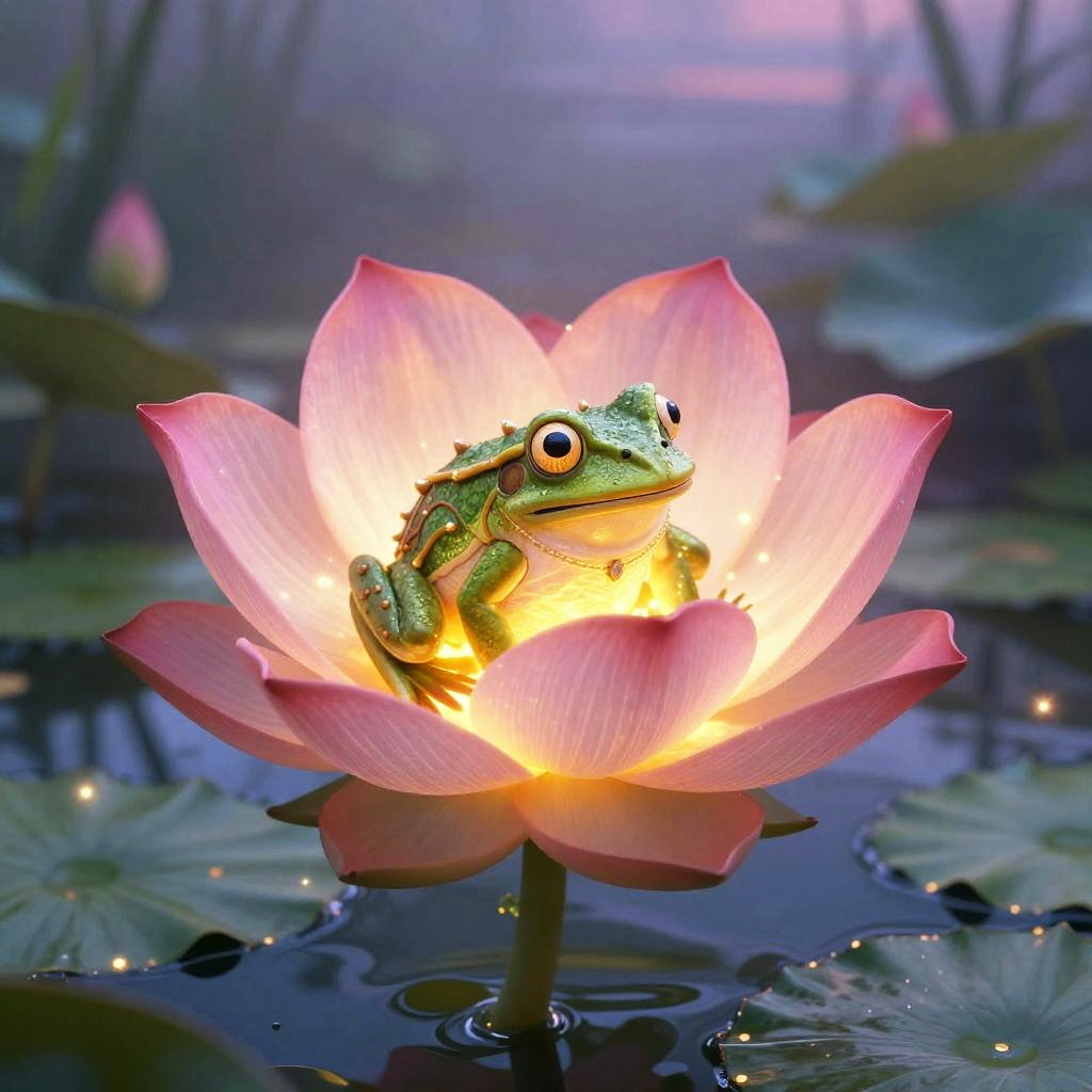 Princess and the frog flower with a royal frog prince nearby, glowing enchanted blossoms, colorful swamp lilies, magical forest ambiance, twilight blues and purples, detailed and atmospheric