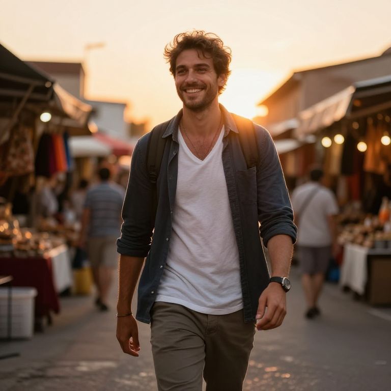 A man, linen v-neck tee, loose-fit lounge pants, soft beige, warm weather, vibrant stalls, fresh produce, aromatic spices, oversaturated film, relaxed smile, enjoying the moment. Man has masculine face and piercing eyes