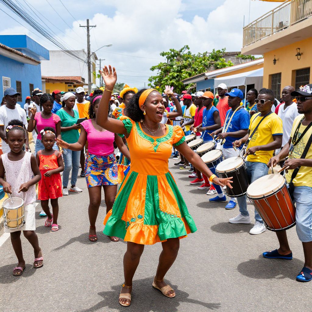 The image depicts a vibrant and lively scene of a Haitian Carnival on a sunny day, filled with joyous dancers and rhythmic drum players. The central figure, a woman adorned in a striking orange and green dress, is the focal point of the celebration. She is surrounded by a lively crowd, including children and adults, all dressed in colorful attire that reflects the festive atmosphere. The drum players, positioned to the right, are energetically striking their instruments, adding to the dynamic energy of the scene. The background features a picturesque street lined with colorful buildings, their bright hues complementing the lively scene. The interplay of colors, textures, and shapes creates a sense of movement and excitement, capturing the essence of a traditional Haitian Carnival.
