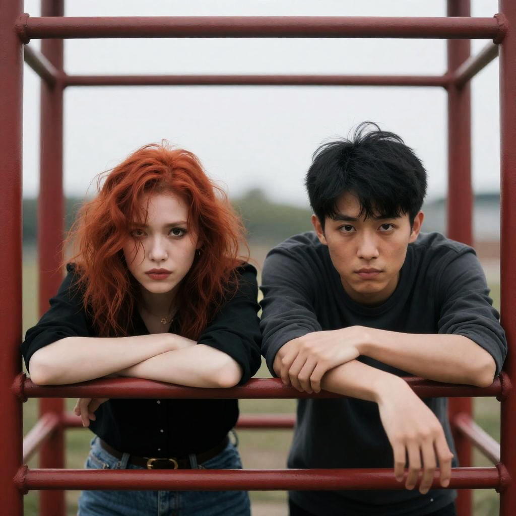 Two people under a red metal structure. Woman with messy red hair, intense gaze, black shirt, leaning forward. Man with short black hair, neutral expression, dark shirt, leaning forward. Background: blurred outdoor setting. Both arms resting on metal bars.