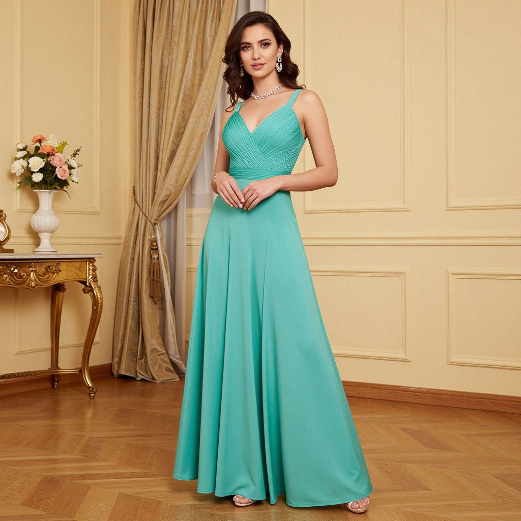 Photograph of a dark-haired woman in a turquoise, sleeveless, V-neck gown with a flowing skirt, standing in a elegant room with beige walls