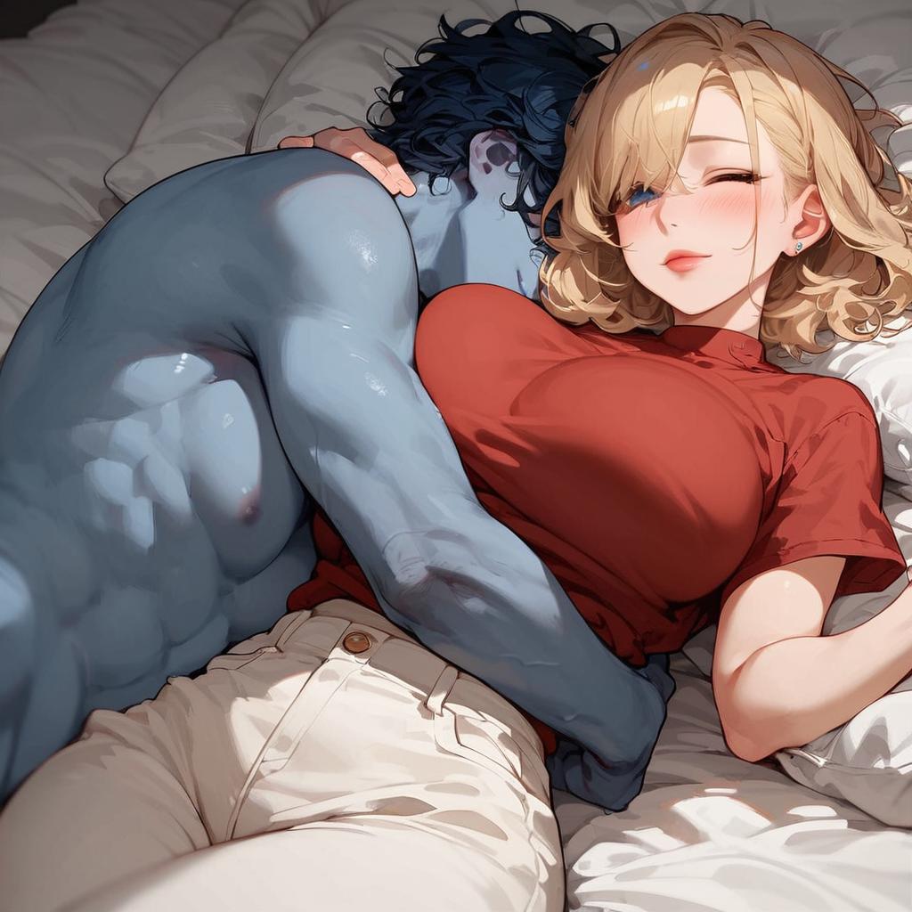Score_9, score_8_up, score_7_up, score_6_up, score_5_up, score_4_up, ippan_josei, blue skin, blonde, shy, happy, blushed, red shirt, pants, wide hips, big breasts, medium hair anime style, source anime