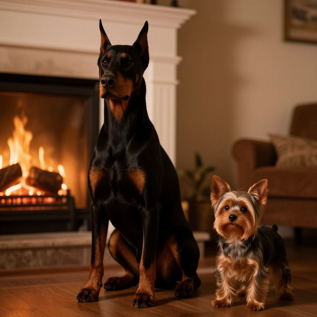 A Doberman and Yorkie mix sitting calmly near a cozy fireplace, blending the elegance of Doberman with the charm of Yorkie, warm indoor lighting casting soft shadows, realistic textures of fur and environment, peaceful and inviting atmosphere