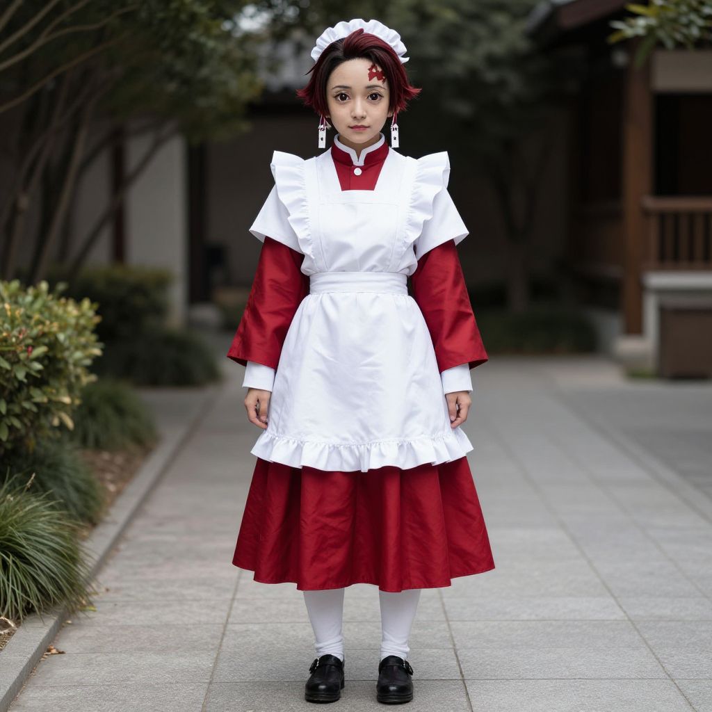 Tanjiro Maid Costume, dressed in a white dress and red skirt standing on a sidewalk