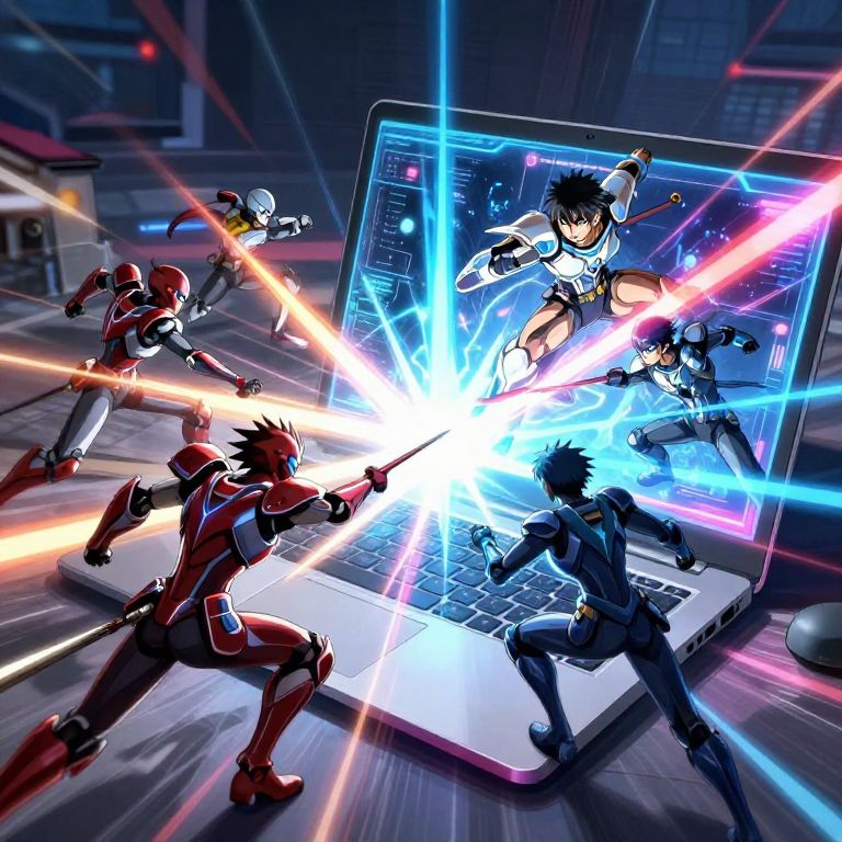 Anime laptop background illustrating a dynamic battle scene on a digital battlefield, anime warriors clad in futuristic armor fighting around a giant laptop console emitting powerful energy beams, dramatic lighting and motion blur capturing the intense action and high-tech vibe.