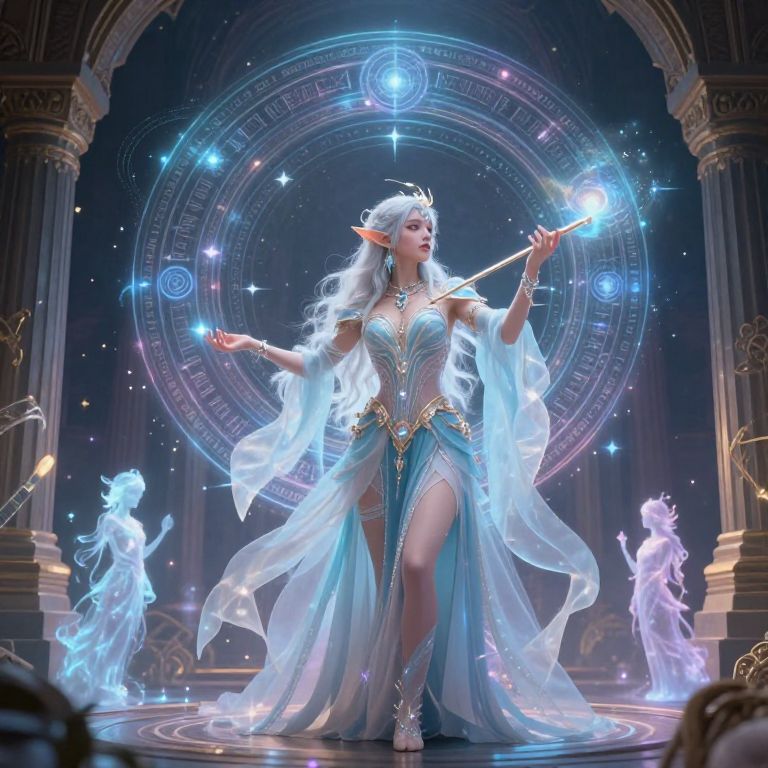 Photorealistic digital artwork of an ethereal, elven sorceress with long, flowing silver hair and pointed ears, standing on a circular, illuminated stage. She wears a revealing, teal and gold gown with translucent, flowing sleeves and a high slit, revealing her toned legs. She holds a glowing wand in her right hand, and her left hand is raised. The background features a large, glowing magical circle with intricate symbols and star-like sparkles. Two translucent, blue ethereal figures dance on either side of her, adding a mystical ambiance. The stage is framed by ornate, classical columns, enhancing the magical, fantasy setting.