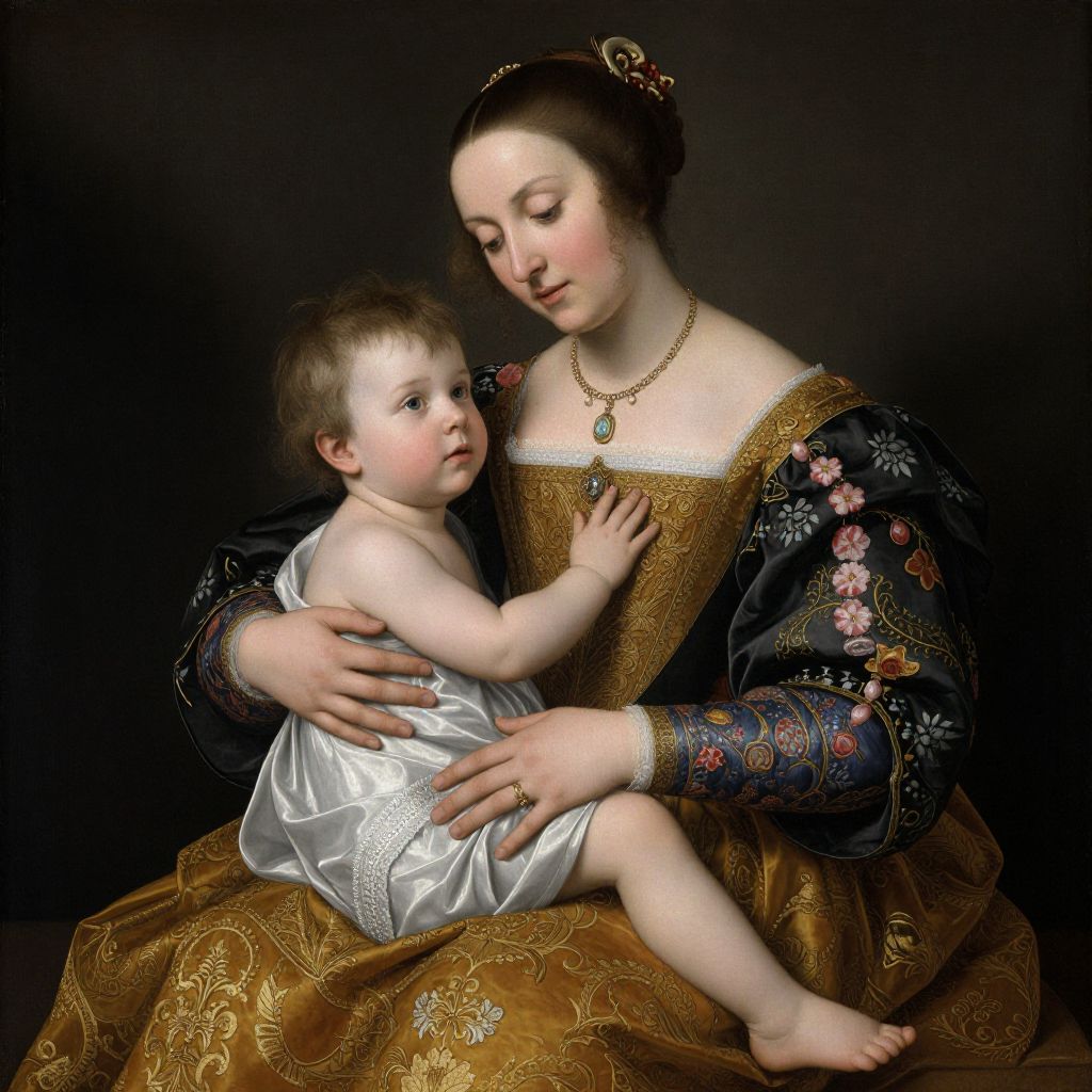 Renaissance-style painting of a fair-skinned woman in ornate dark blue dress with gold patterns, holding a chubby, fair-skinned baby in