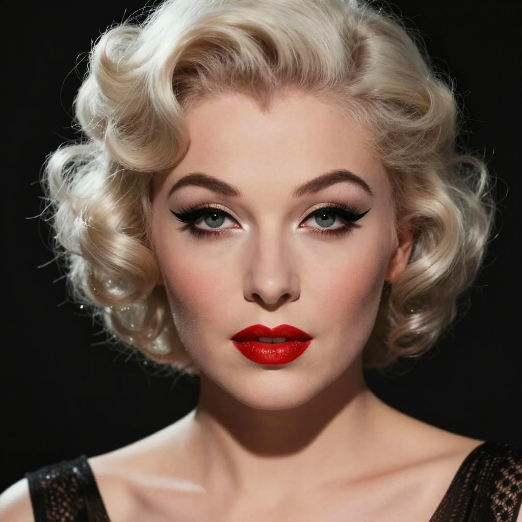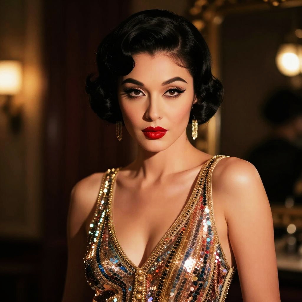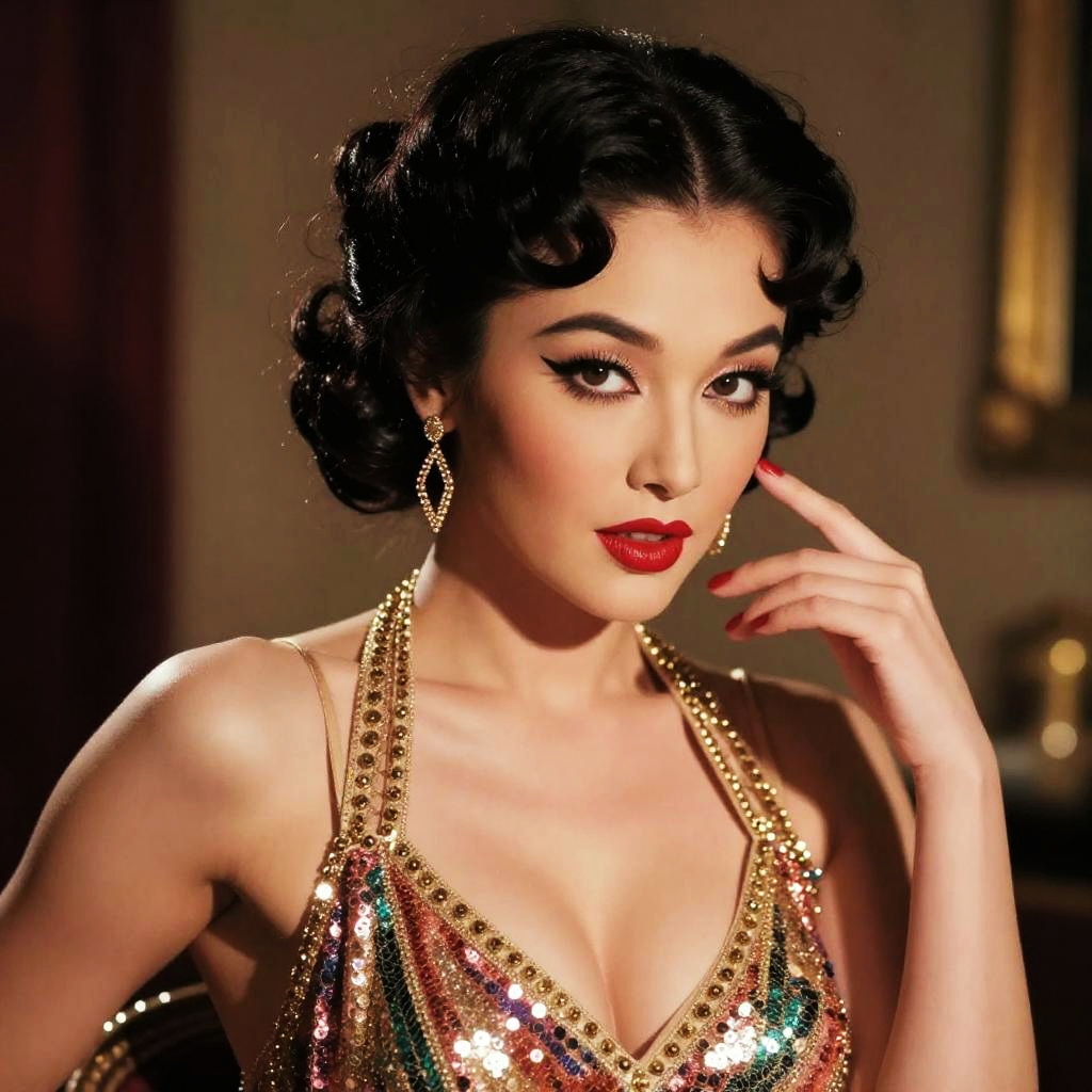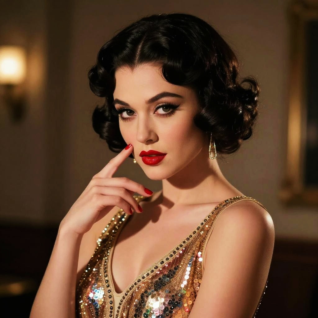 Ultra-realistic portrait of an androgynous vaudeville performer with dramatic eyeliner styled as Betty Boop, shot on a DSLR, cinematic lighting, high detail, soft skin texture, glossy red lips, 1920s vintage aesthetic, inspired by Man Ray, cinematic portrait.