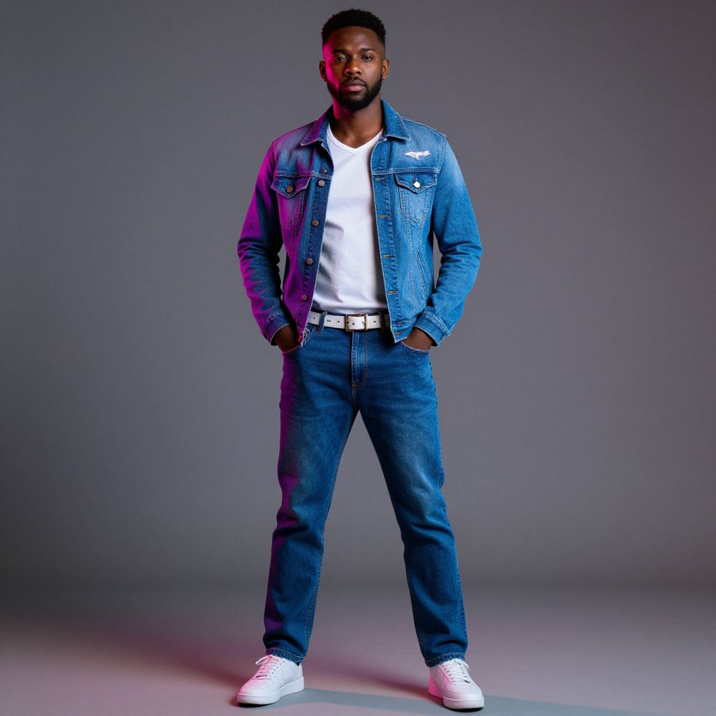Neon outfit man costume, 1boy, male focus, solo, hands in pockets, denim, shirt, pants, dark skin, dark-skinned male, shoes, vest, jeans, belt, white shirt, facial hair