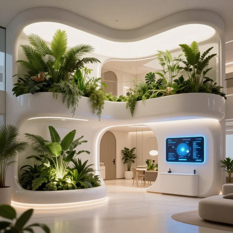 Futuristic homes interior featuring a blend of natural elements and cutting-edge technology, with indoor vertical gardens, touch-sensitive surfaces, adaptive climate control, minimalist design, and soft glowing lights providing a serene yet advanced atmosphere.
