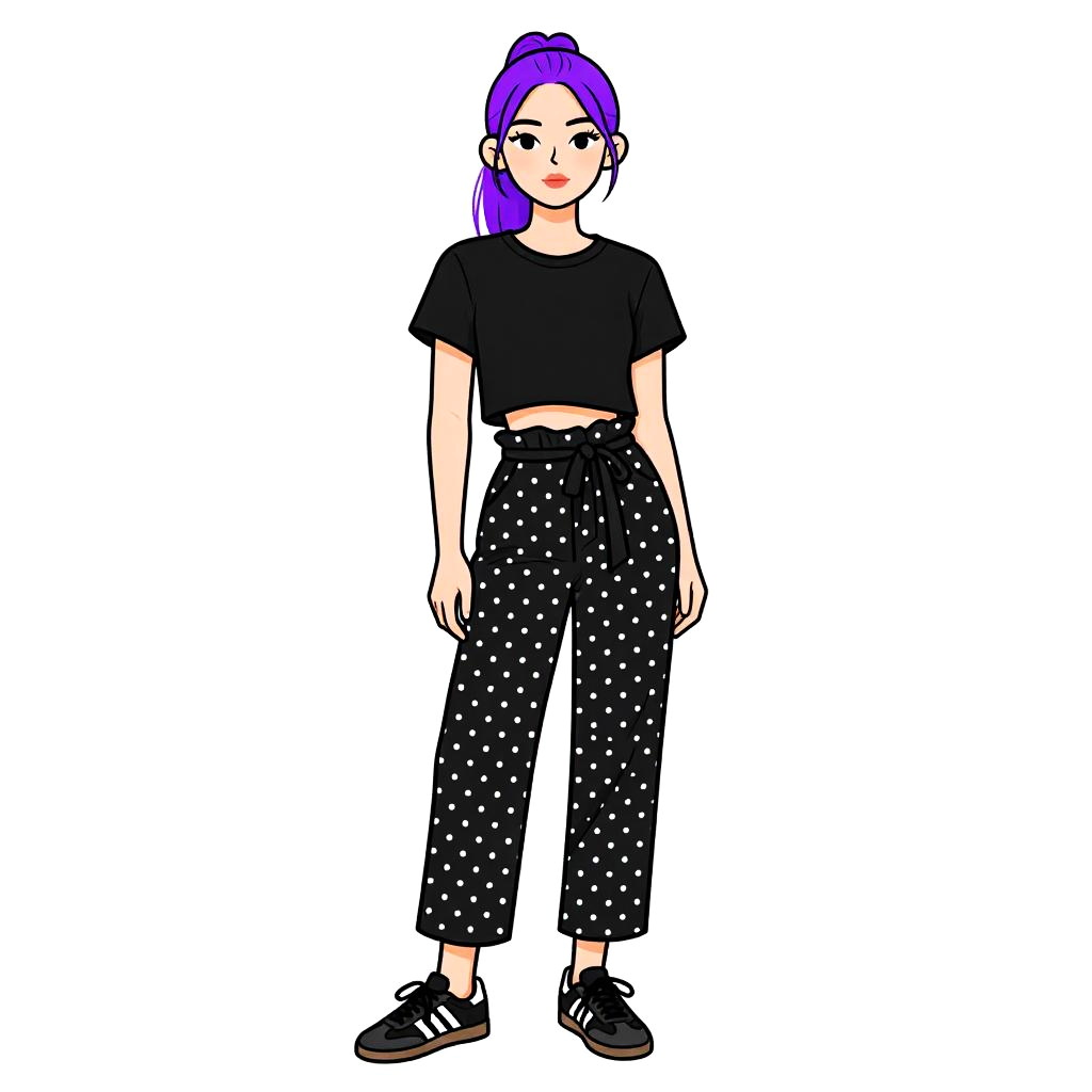 Illustration of a young woman with purple ponytail hairstyle and simple makeup, wearing a black cropped t-shirt paired with high-waisted black trousers with white polka dots and a tied belt at the waist. She is also wearing black sneakers with white stripes. The outfit showcases relaxed streetwear style on a plain white studio background.