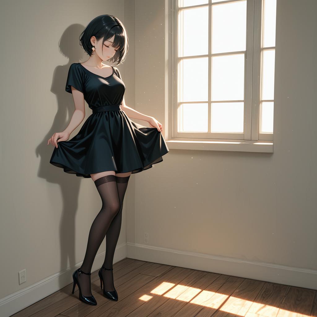 A full-body portrait of a woman with short black hair wearing a black short-sleeve dress and black high heels. She is standing indoors near a large sunlit window, gently holding the skirt of her dress. The scene includes natural sunlight casting shadows on a wooden floor and a beige wall. The woman has her eyes closed, wearing earrings and subtle makeup, creating a serene and elegant ambiance.