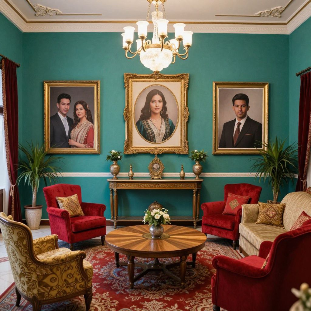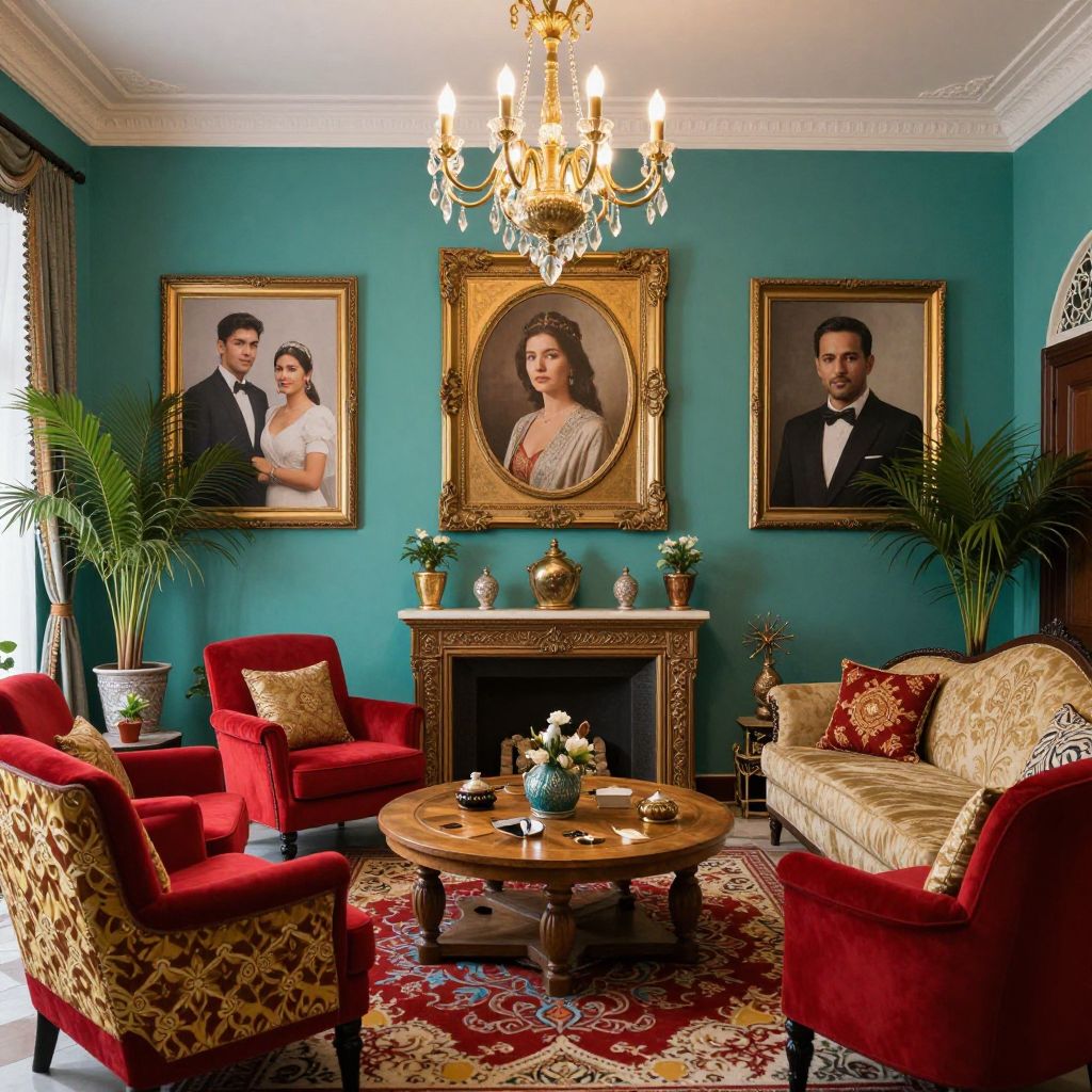 Elegant Moroccan living room exudes opulence with teal walls adorned by three framed portraits, including a central oval portrait of a woman, flanked by a couple and a man, while a grand chandelier illuminates the space above a round wooden coffee table surrounded by vibrant red armchairs, a gold-patterned chair, and a plush sofa, all complemented by ornate furniture, potted plants, and decorative accents.