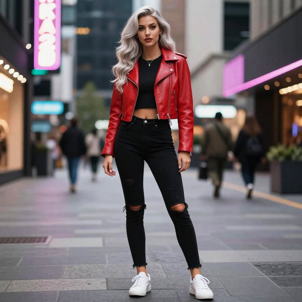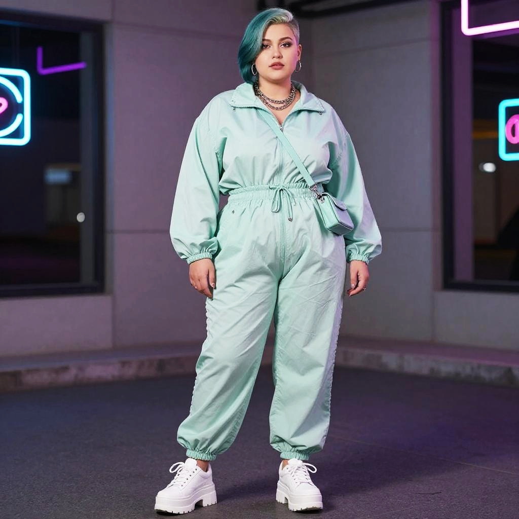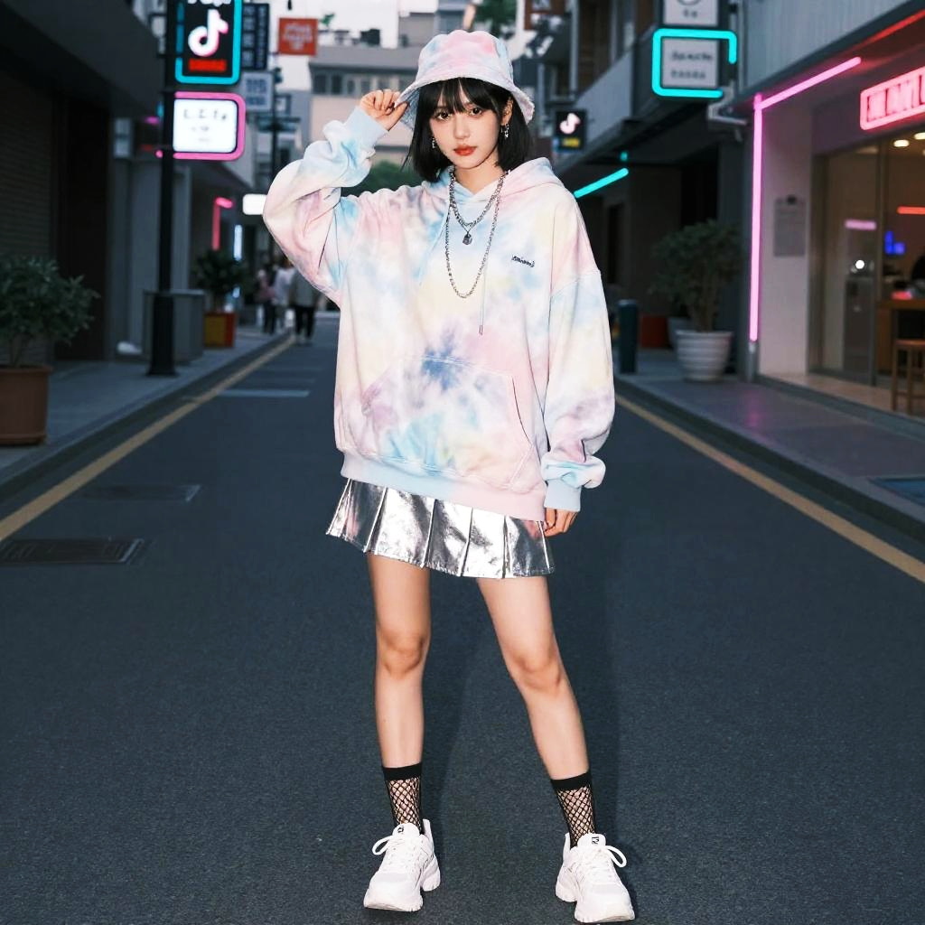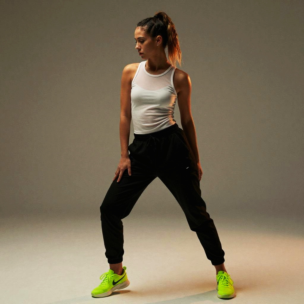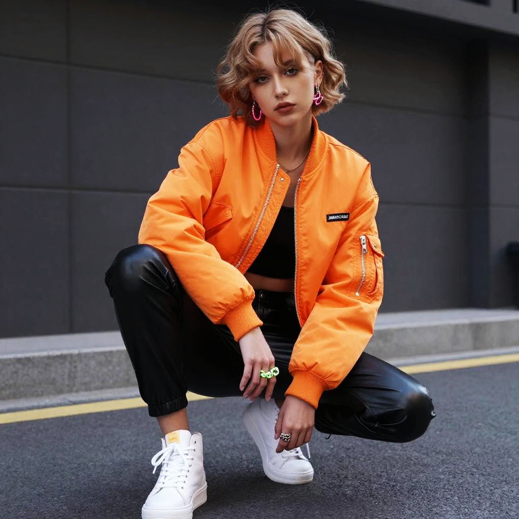 Fitness influencer (late 20s), Athletic with defined abs and toned legs, Sleek high ponytail with braided undercut, douyin outfit, neon coral sports bra under a black mesh cropped hoodie, charcoal high-waisted biker shorts, white chunky trainers, neon scrunchie, slim silver fitness tracker, neon-lit douyin cinematic with warm film grain