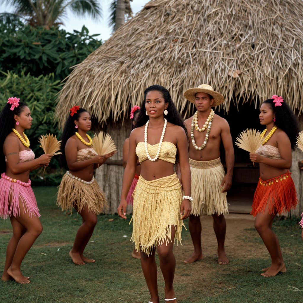 A beautiful black woman in a tropical setting, surrounded by hula dancers and a man in a straw hat, stands in front of a hut with thatched roof, captured in a detailed cinematic still shot from a 1962 movie directed by Lewis Milestone.