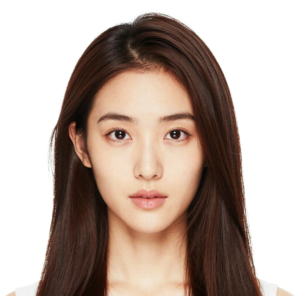Photograph of an East Asian woman with long, straight, dark brown hair, parted in the middle. She has fair skin, large dark eyes, and subtle, natural makeup. Her lips are lightly glossed with a pinkish hue. The background is completely white, making her face the focal point. Her expression is neutral, and she's looking slightly to the right of the camera.