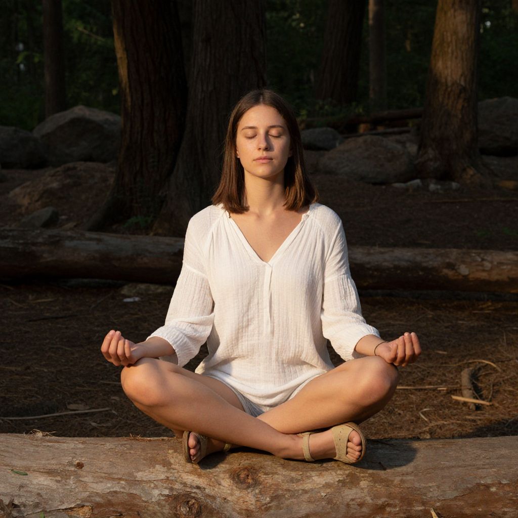 Photograph of a young woman with light brown skin and shoulder-length brown hair, sitting cross-legged on a large, fallen tree trunk in a forest. She's wearing a white, loose, long-sleeved blouse and beige sandals. Her eyes are closed, and she has a calm, meditative expression. The background features dark, rugged tree trunks, rocky ground, and patches of green foliage. The sunlight casts warm, golden hues on her and the surrounding trees.