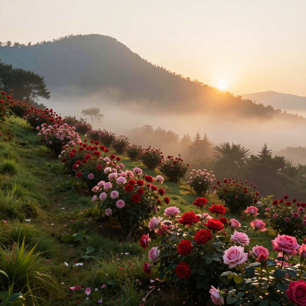 Photograph of a misty sunrise over a lush hillside, adorned with vibrant pink and red roses, creating a romantic, serene landscape.