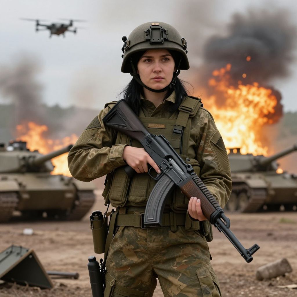 Photograph of a determined female soldier in camouflage uniform and helmet, holding a rifle, standing amid burning tanks and smoke. Helicopter flies in the background