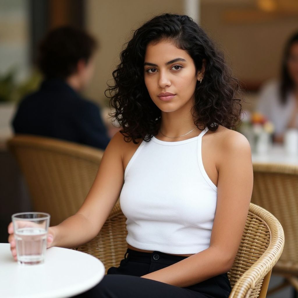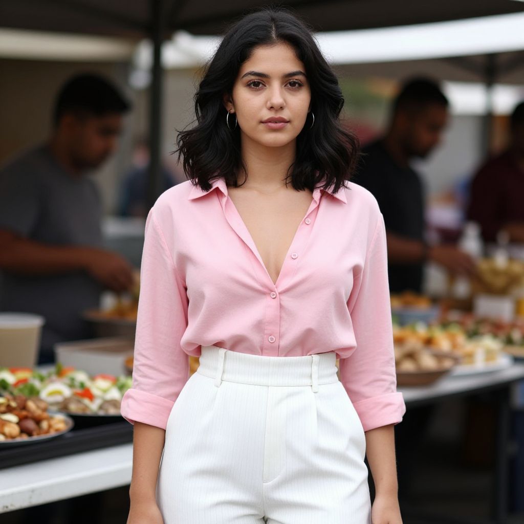 Photograph of a young woman standing at an outdoor food market. She has medium-length, wavy black hair, and is wearing a pink button-up shirt with a deep V-neck, and high-waisted, white, pinstriped shorts. Her makeup is subtle, and she's accessorized with hoop earrings. The background shows blurred market vendors and tables with various dishes. The lighting is natural, and the overall scene is vibrant and casual.
