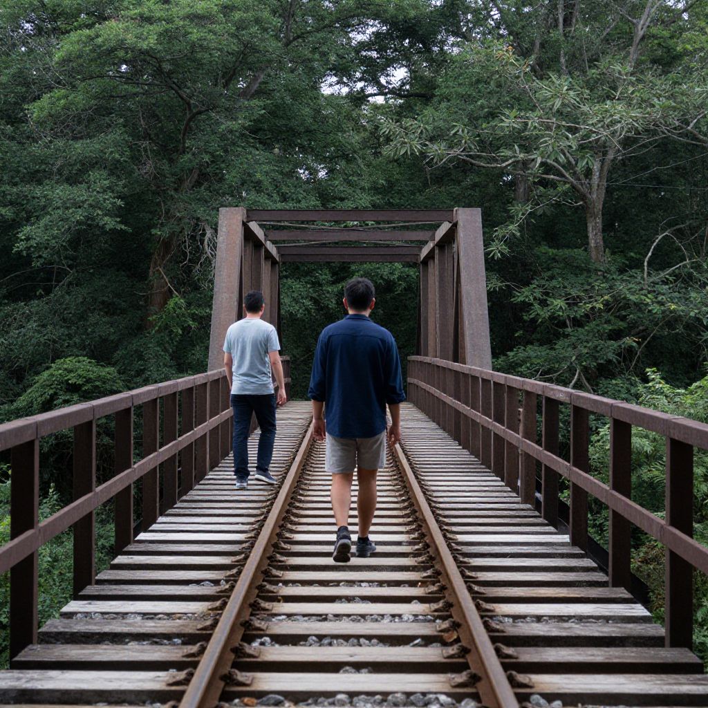Photograph of two men walking away on a narrow, wooden bridge with metal tracks, surrounded by dense, green foliage. The man on the left wears a white shirt and dark pants, while the man on the right is in a dark blue shirt and beige shorts, with black shoes. The bridge has wooden railings on both sides and leads into a shadowy, tree-filled area. The lighting is natural, casting a slight shadow on the track beneath their feet. The overall mood is serene and slightly mysterious, with the dense forest creating a natural, secluded atmosphere.