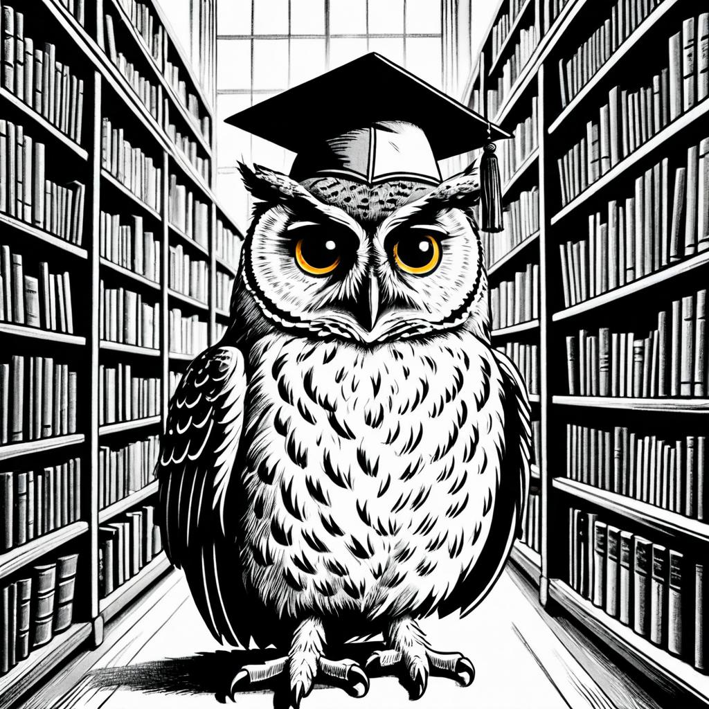 Cartoon illustration of a detailed owl wearing a graduation cap, standing in a library aisle with tall bookshelves filled with books. The image features intricate line art with shading and emphasizes the owl's large, expressive eyes.