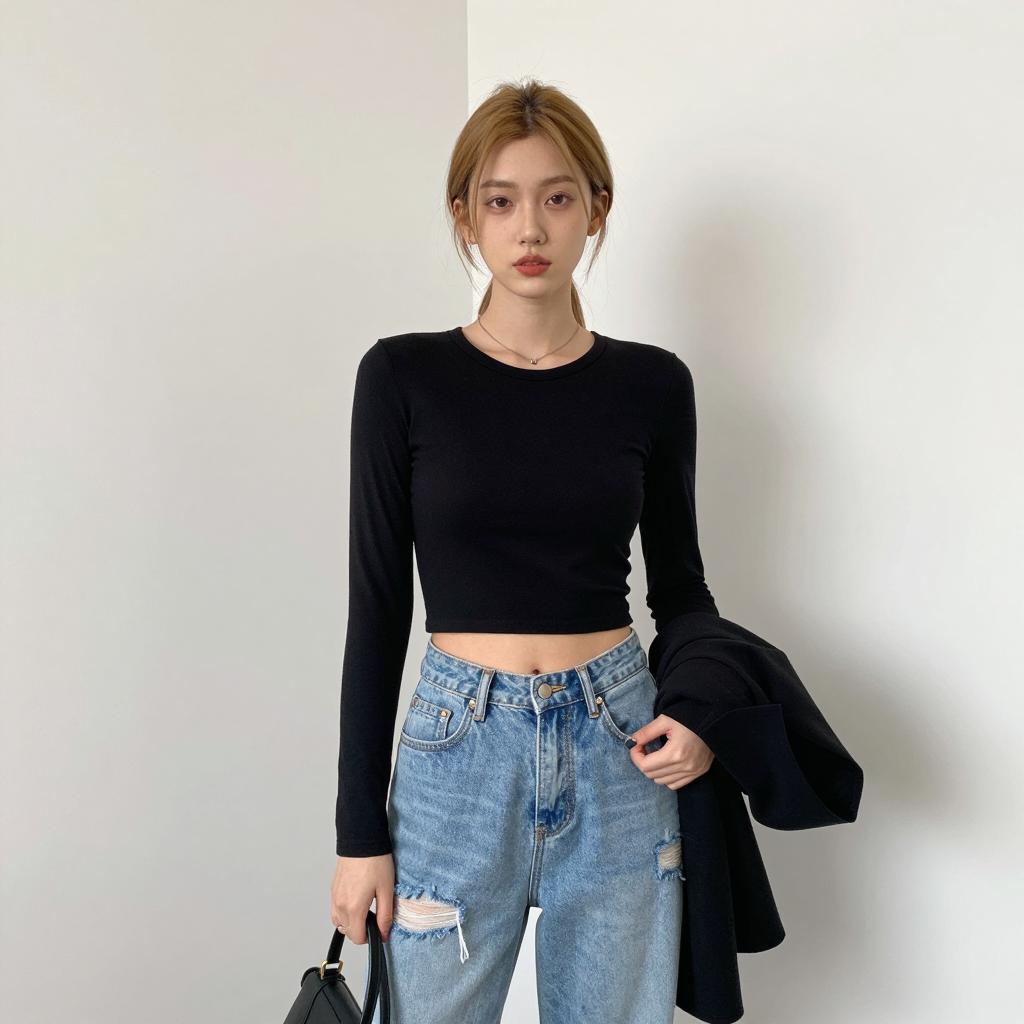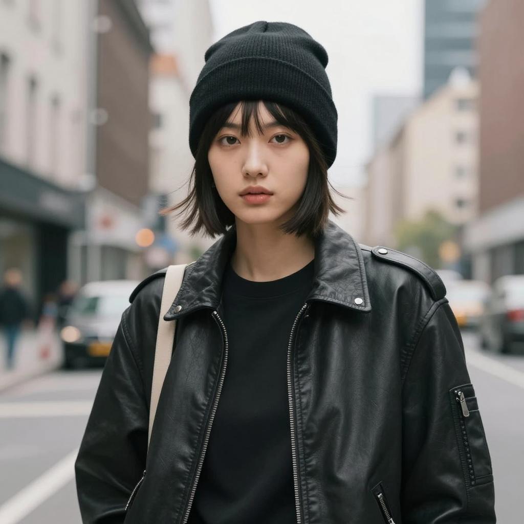 Woman with long brown hair, black cap, black leather jacket, black top, blue jeans, sitting, holding white cup with blue straw. Background: wall with cupcake photos, beige chairs, man in black jacket standing. Bright indoor setting. Intense eye contact.