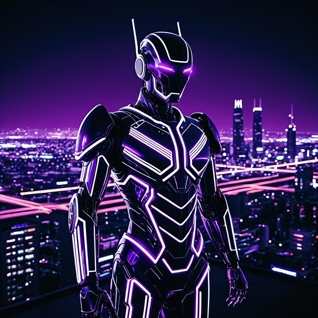 A futuristic android, sleek chrome body with glowing purple circuit patterns, neon-lit cityscape at night, majestic and rhythmic.