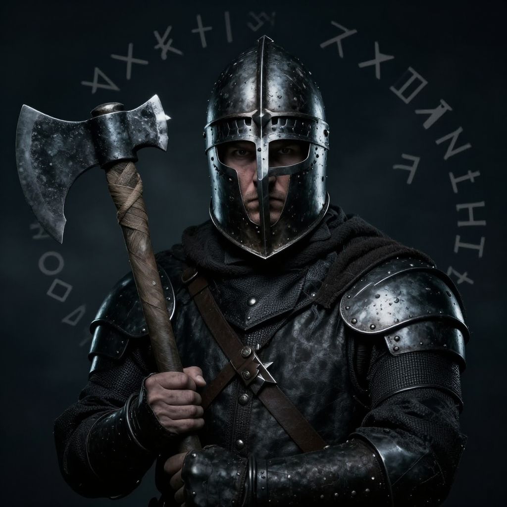 Photograph of a fierce medieval warrior in dark, metallic armor with a reflective, silver helmet and a double-edged axe. The warrior's face is partially visible through the helmet's eye slit, showing a stern expression. He holds the axe with both hands, gripping the wooden shaft wrapped in dark leather. The background is black with white, partially visible runes encircling the warrior. The armor has a textured, chainmail pattern, and the overall lighting emphasizes the metallic sheen and the warrior's intense, focused demeanor. The image conveys a sense of strength and readiness for battle.
