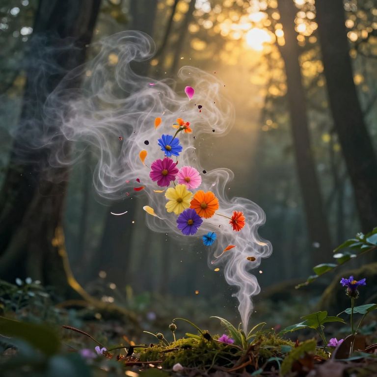 Photograph of a mystical forest scene at sunrise. A swirling cloud of white smoke rises from the forest floor, carrying a bouquet of colorful flowers, including pink, yellow, orange, and blue daisies. The sun's golden light filters through tall, dark tree trunks in the background, creating a magical atmosphere. Small petals and flower fragments float around the smoke. The forest floor is covered in moss and scattered with purple wildflowers. The image has a surreal, ethereal quality, blending natural and magical elements.