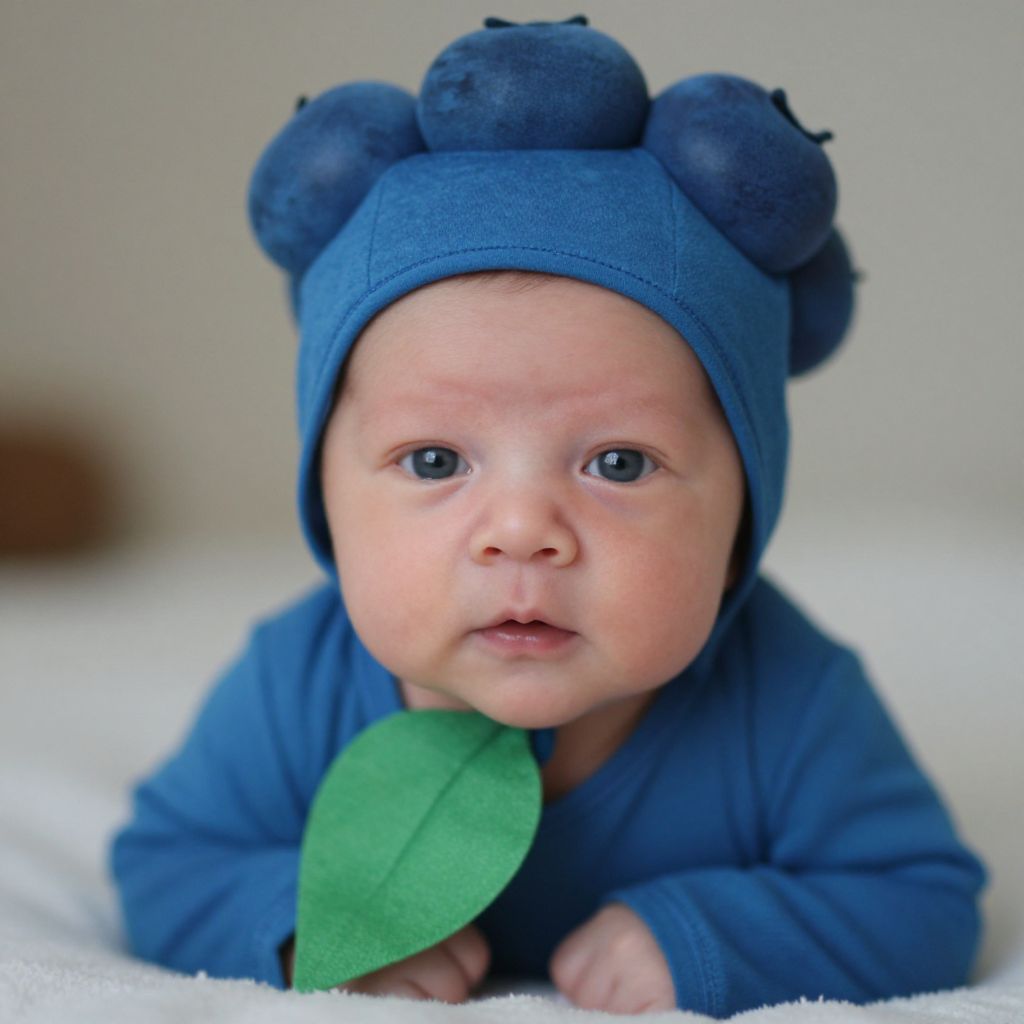 Newborn blueberry costume, solo, looking at viewer, blurry, blue eyes, blurry background, realistic, closed mouth, leaf, male focus, alien