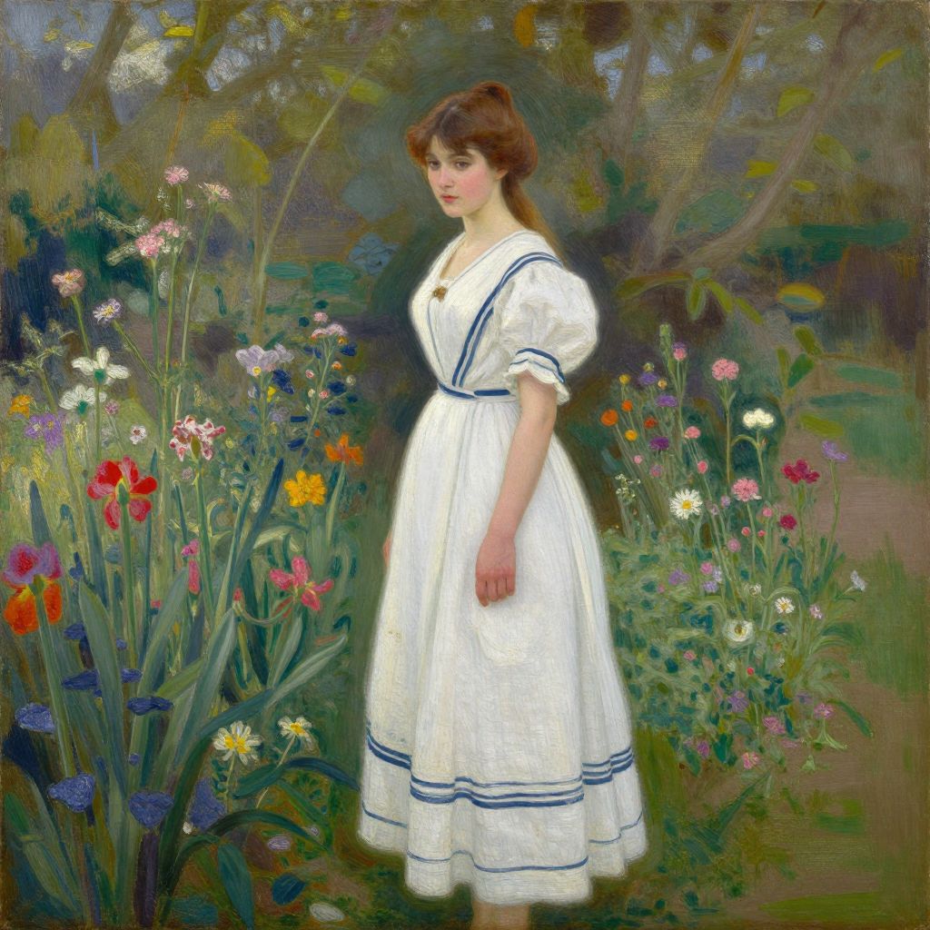 A painting of a young woman in a white dress with blue stripes, standing in a colorful, vibrant garden. She has red hair and a gentle expression