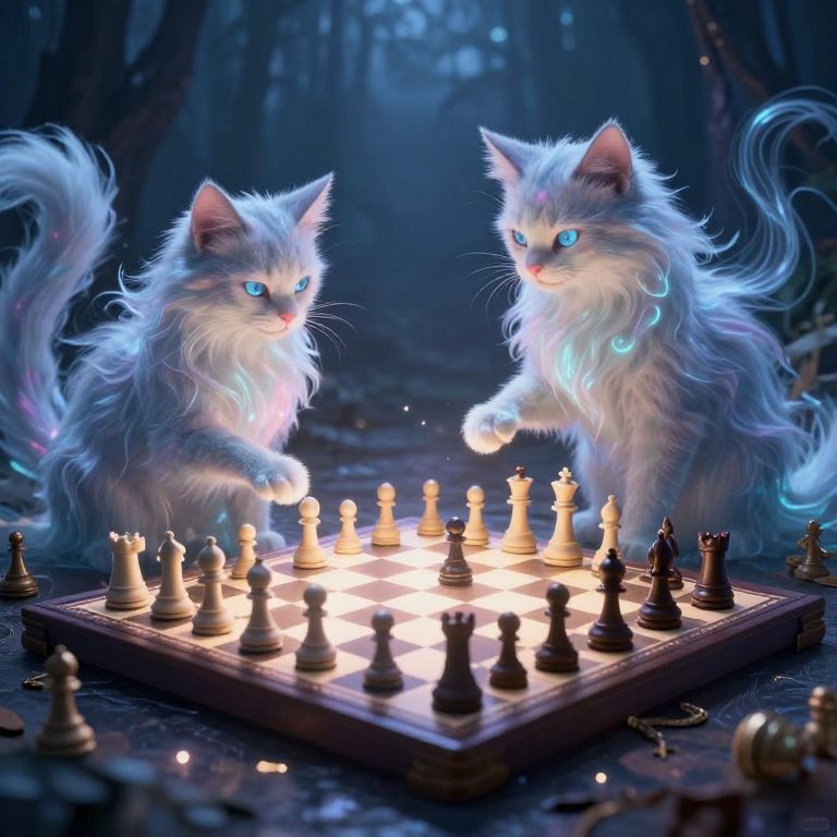 In a mystical twilight realm, ethereal feline spirits with flowing fur and luminous eyes engage in a strategic game of chess, their ghostly hands hovering over a glowing board as they reshape unseen destinies with each deliberate move.