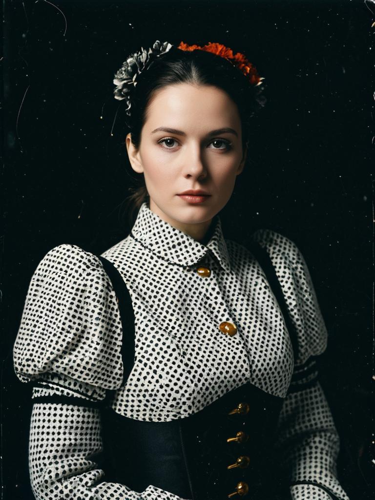Photograph of a young woman with fair skin and dark brown hair, styled with a small red flower and black lace ribbon. She wears a white, long-sleeved, polka-dotted blouse with puffed shoulders, cinched at the waist with a black corset. Her expression is neutral, with slightly parted lips and dark, subtle eye makeup. The background is black with small white specks, giving a starry night effect. The image has a high contrast, with sharp focus on the woman and a slightly blurred background. The overall style is vintage, reminiscent of 1950s fashion photography.