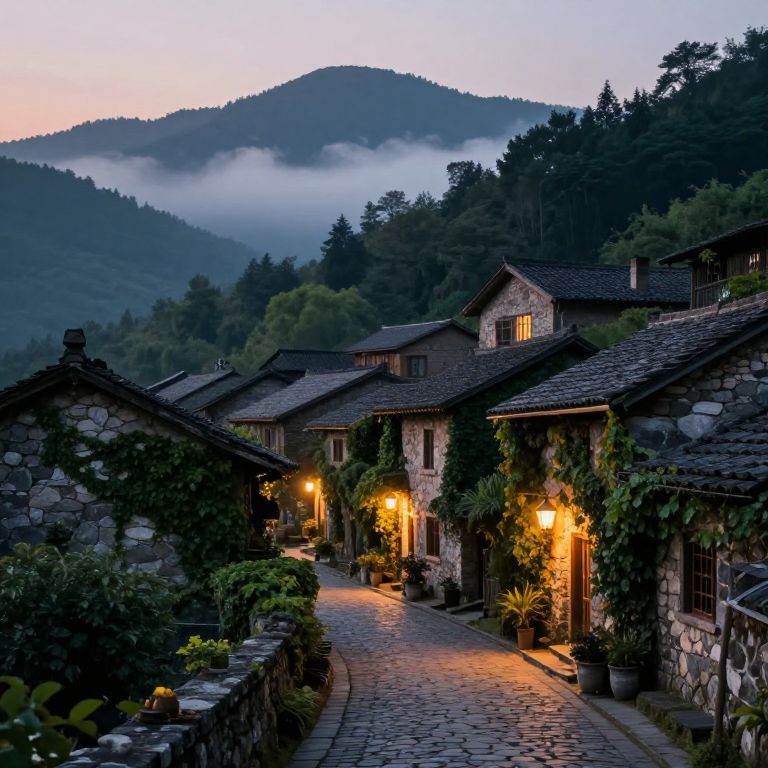 Ligon, a mysterious ancient village nestled between misty mountains and dense forests, bathed in the soft glow of twilight, with intricate stone houses covered in ivy and lanterns illuminating cobblestone streets, evoking a magical and serene atmosphere.