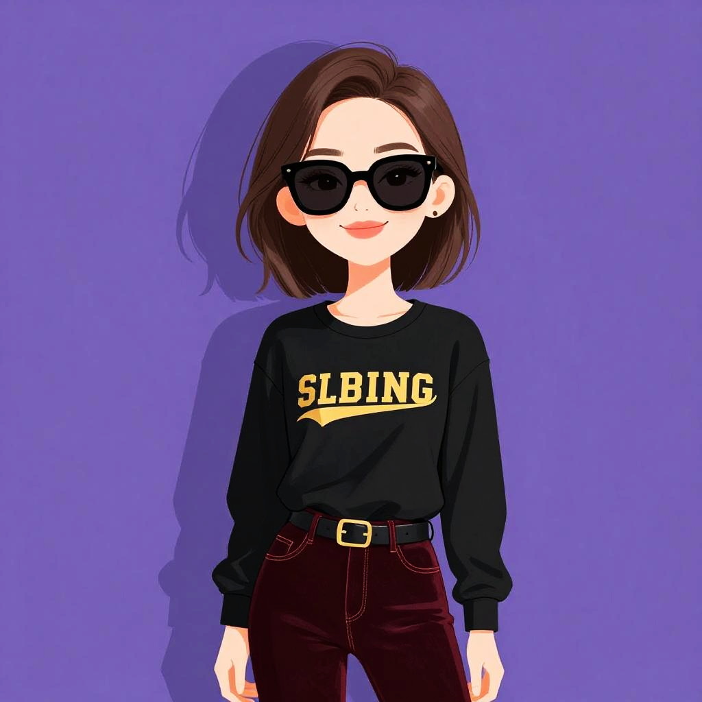 Woman with pretty face and pretty hair. smiling Woman, casual, black long-sleeve crew neck graphic tee with gold lettering, dark red velvet-textured skinny pants, oversized black sunglasses. --sref 1461