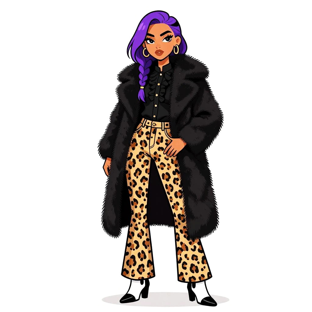 Woman with pretty face and pretty hair. Woman, contemporary street style, oversized faux fur coat in cow print with brown and white patches, cable knit cropped sweater in burgundy, white denim mini skirt, pointed-toe ankle boots in white with black detailing, minimal jewelry, straight long hair, white studio background. --sref 1467