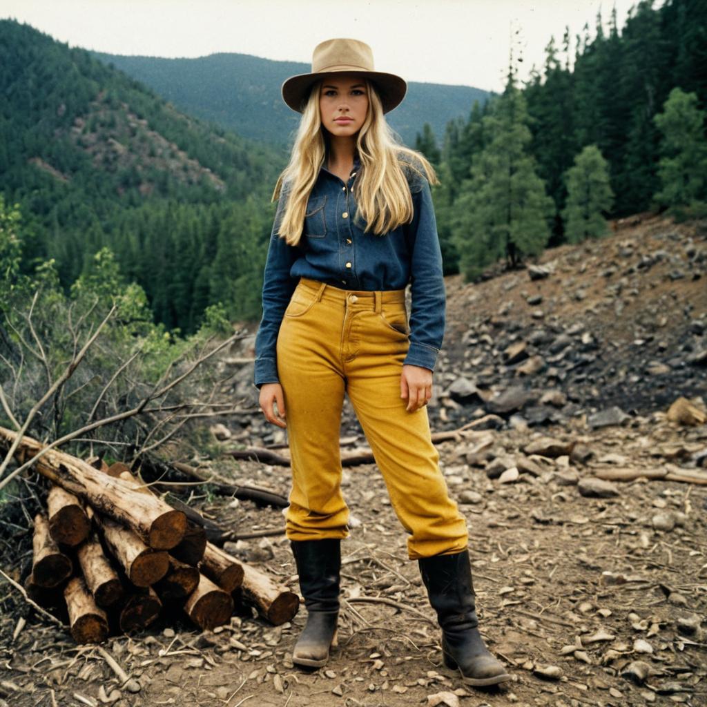 Gold rush miner outfit,solo, 1girl, blonde hair, hat, boots, long hair, outdoors, pants, looking at viewer, standing, nature, holding