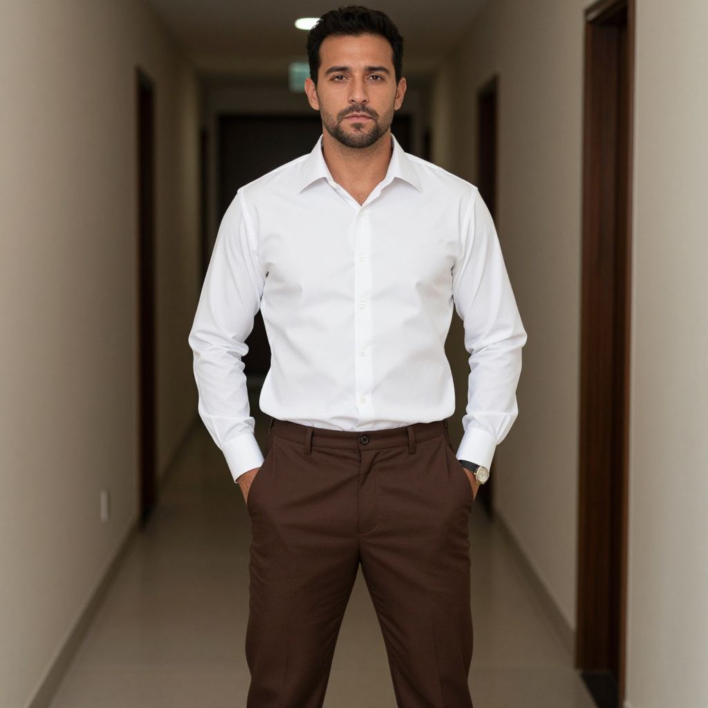 Brown Pant White Shirt Costume, man standing in a hallway with his hands in his pockets