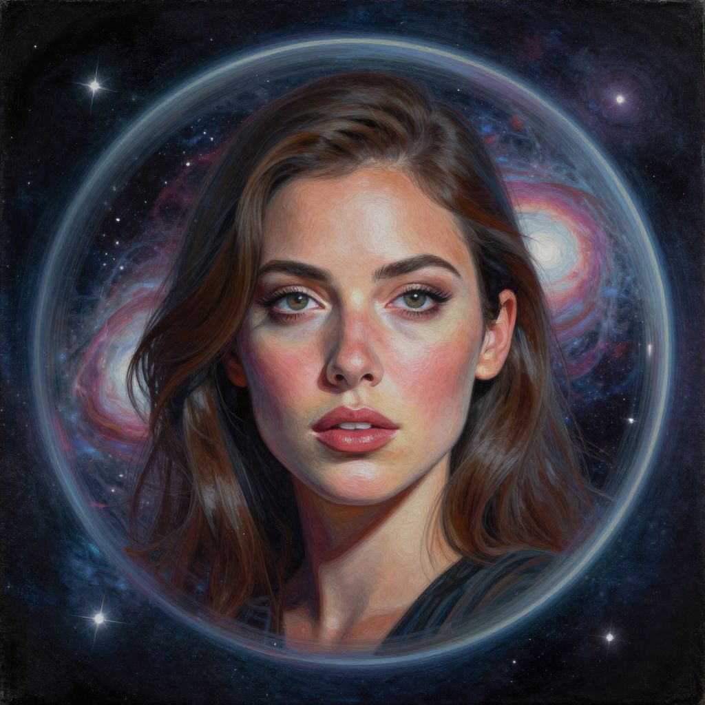 A close-up portrait of a woman inside a sphere, with cosmic galactic surroundings, depicted in acrylic art with dynamic lighting and realistic details.