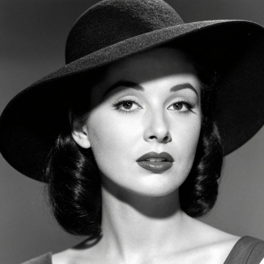 A striking black-and-white close-up of a woman in a wide-brimmed hat, reminiscent of classic Hollywood glamour, captured with dramatic lighting and a vintage photographic style.