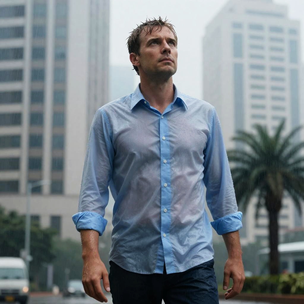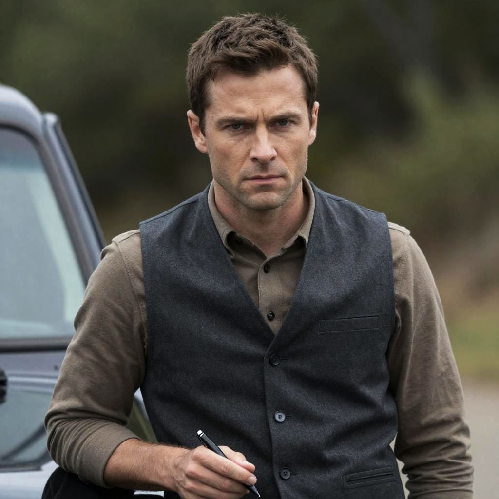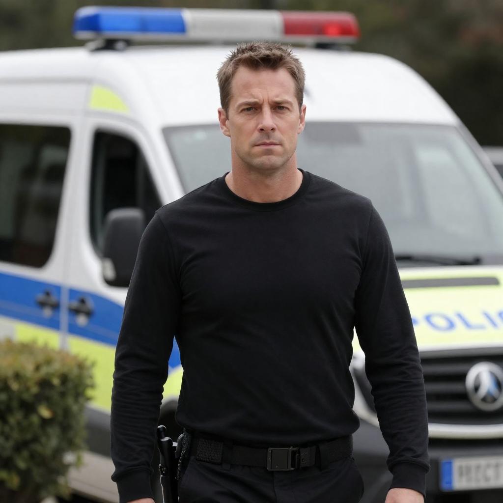 Photograph of a serious-looking white man with short brown hair, wearing a gray shirt, leaning over the roof of a white car. Background includes a red and white fire truck and a building with a chain-link fence. A large yellow and red "12 Hours" sign is in the background.