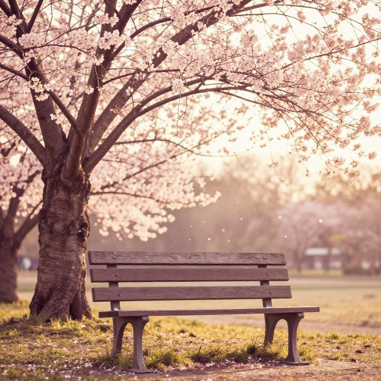 Sentimental scene of an old wooden bench under a blooming cherry blossom tree in soft golden sunset light, gentle breeze carrying petals, vintage photo style with warm pastel tones, evoking nostalgia and heartfelt memories.