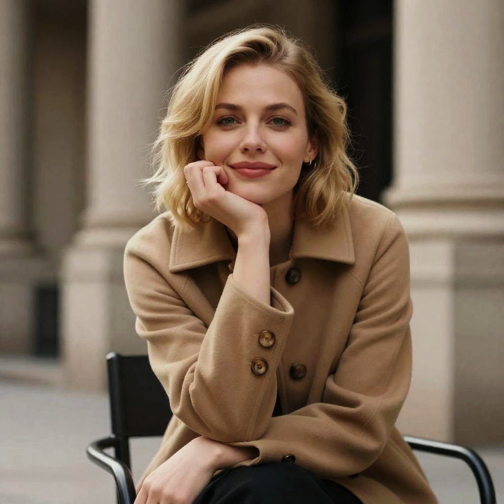 Photograph of a blonde woman with short, layered hair and blue eyes, wearing a yellow turtleneck. She has a slight smile. Background shows a blurred, busy setting with various colorful objects and a person in green.