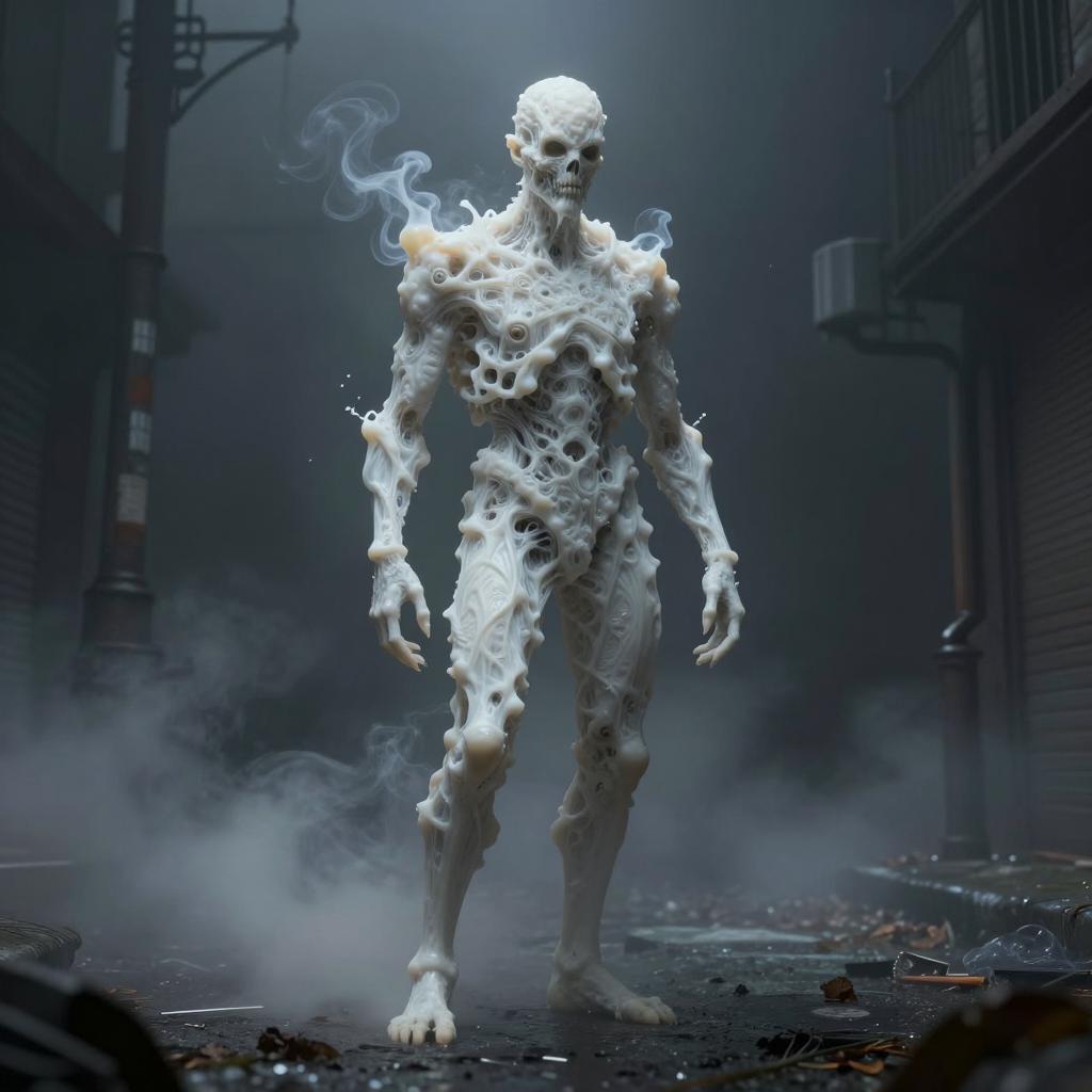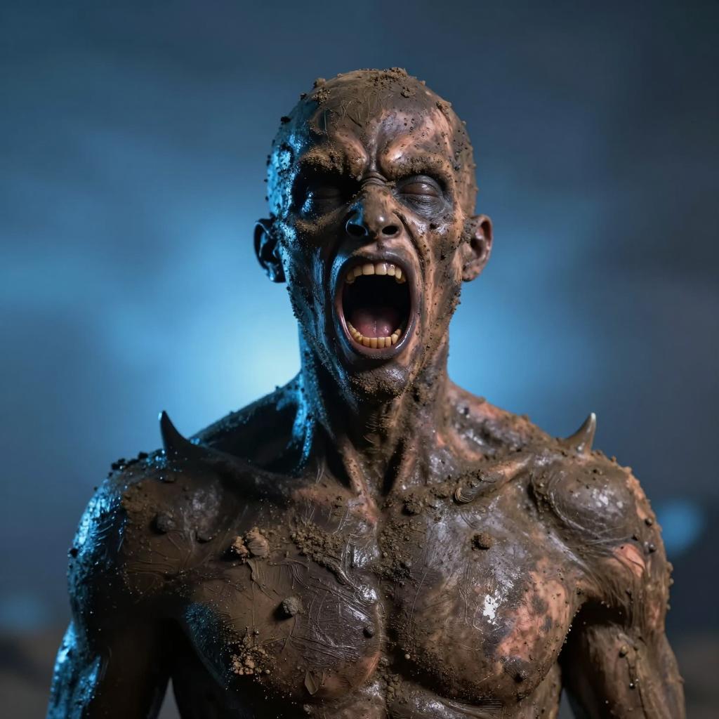 Distorted humanoid figure with dark, mud-like skin and exaggerated facial features, mouth open in a scream. Blue light illuminates from behind, highlighting contours. Two small, claw-like protrusions on shoulders. Background is blurred blue light.