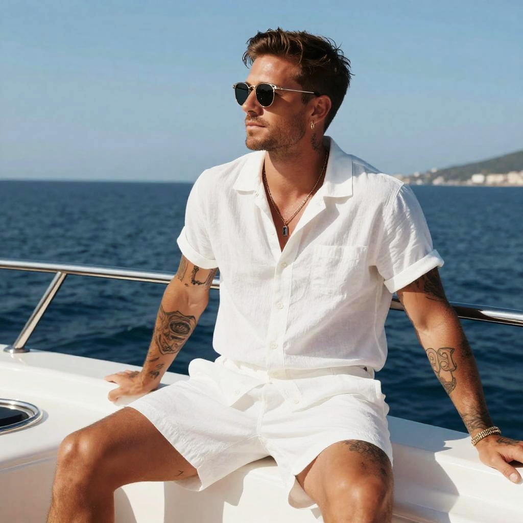 A confident man with tattoos enjoys the sun aboard a luxurious yacht, dressed in a casual white outfit and stylish sunglasses. The stunning ocean view in the background enhances the feeling of leisure and sophistication, perfect for a summer getaway.