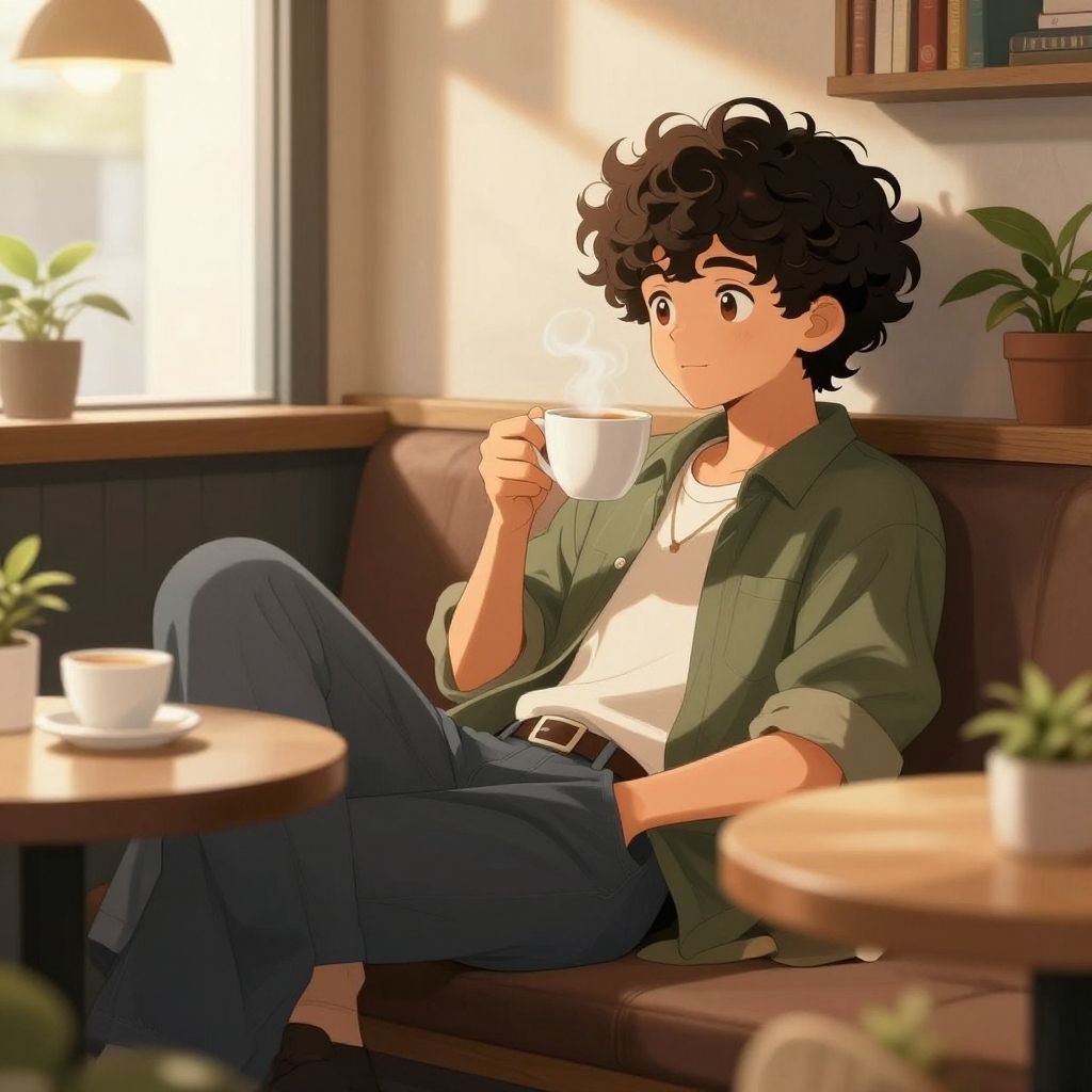 Curly haired anime character lounging in a cozy café, holding a steaming cup of tea, warm sunlight through window, casual modern clothes, detailed interior with books and plants.