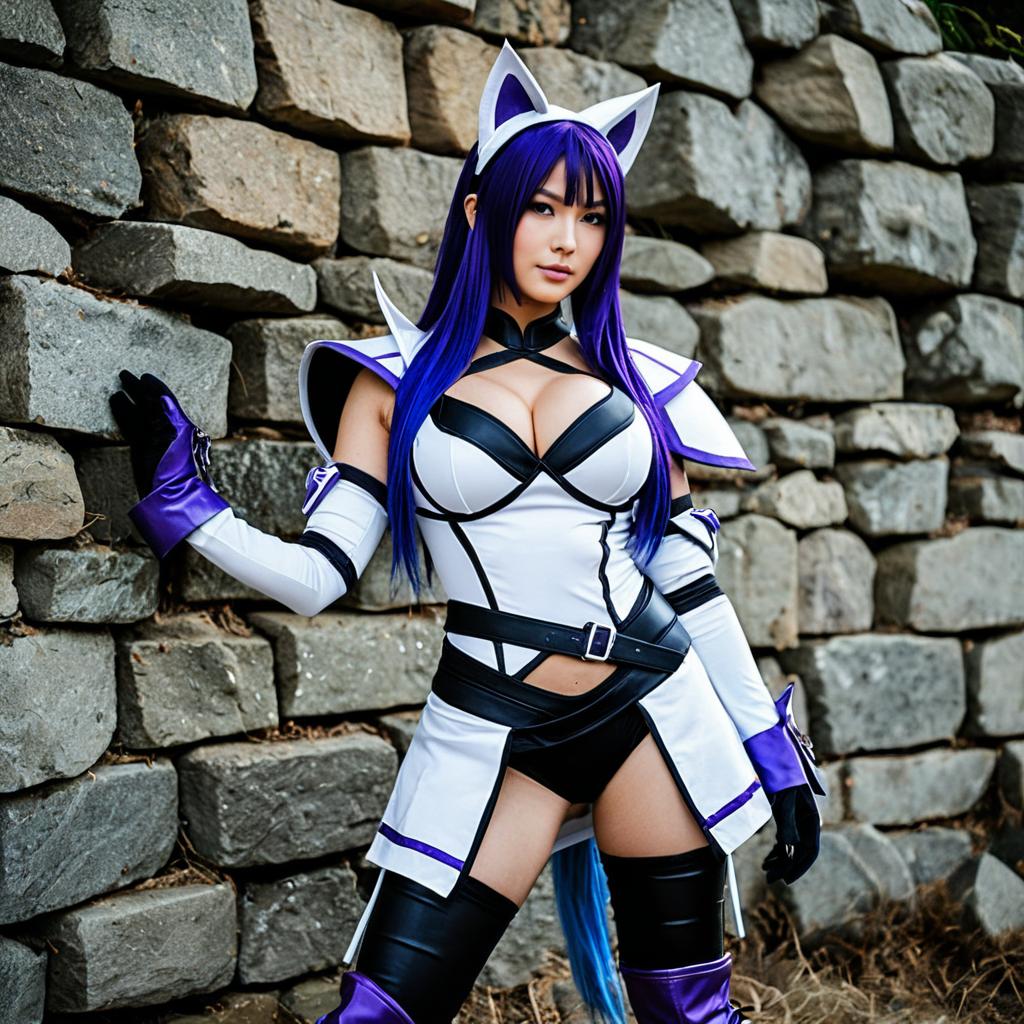 Photo-realistic cosplay photo of person in ishtar (fire emblem) costume. Full body. Standing. Full length. 1girl, purple eyes, purple hair, long hair, very long hair, ponytail, side ponytail, large breasts, cleavage, thighs, earrings