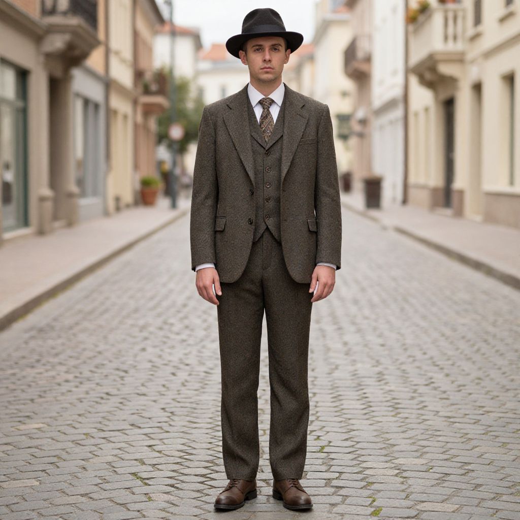 "Vintage Style Costume, man in a suit and hat standing on a cobblestone road"
