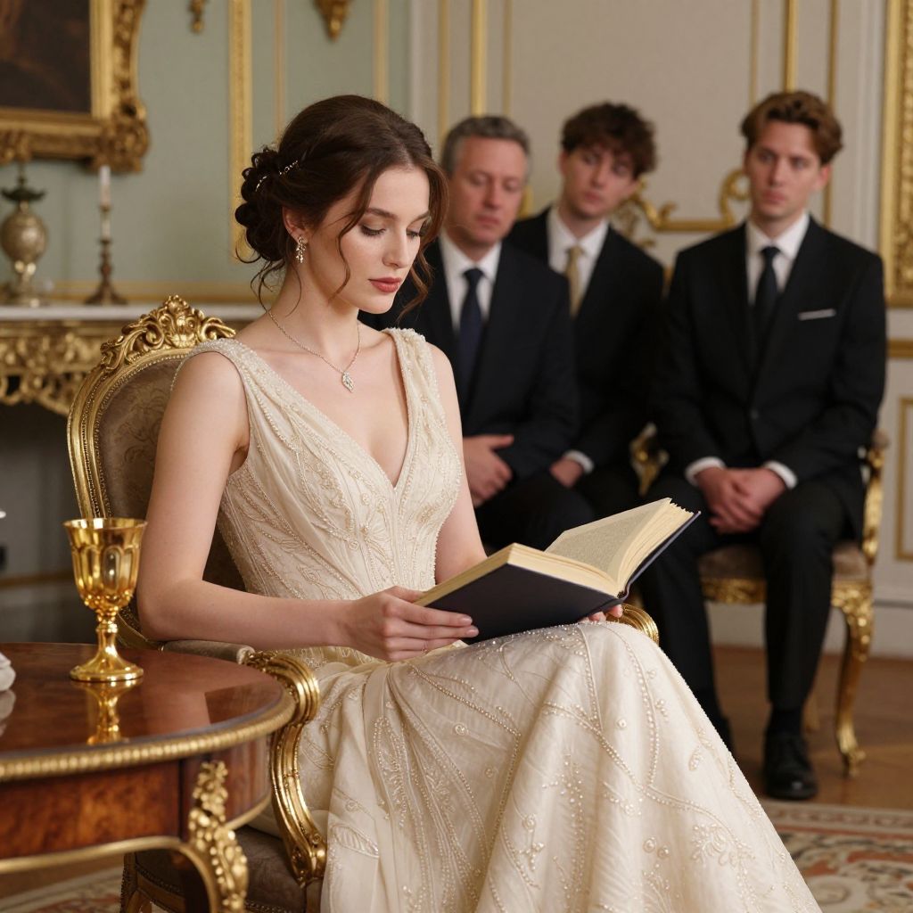 Photograph of a young woman with fair skin and dark brown hair in an elegant updo, wearing a cream-colored, lace-embellished wedding dress with a V-neck and cap sleeves. She sits on an ornate gold chair, reading a book, in a luxurious room with gold-trimmed white walls and a gilded fireplace in the background. Three men in black suits and white shirts, with varying hair styles, sit behind her, attentively watching her. A gold goblet and a small table with a white flower are on the left. The image has a formal, refined atmosphere.